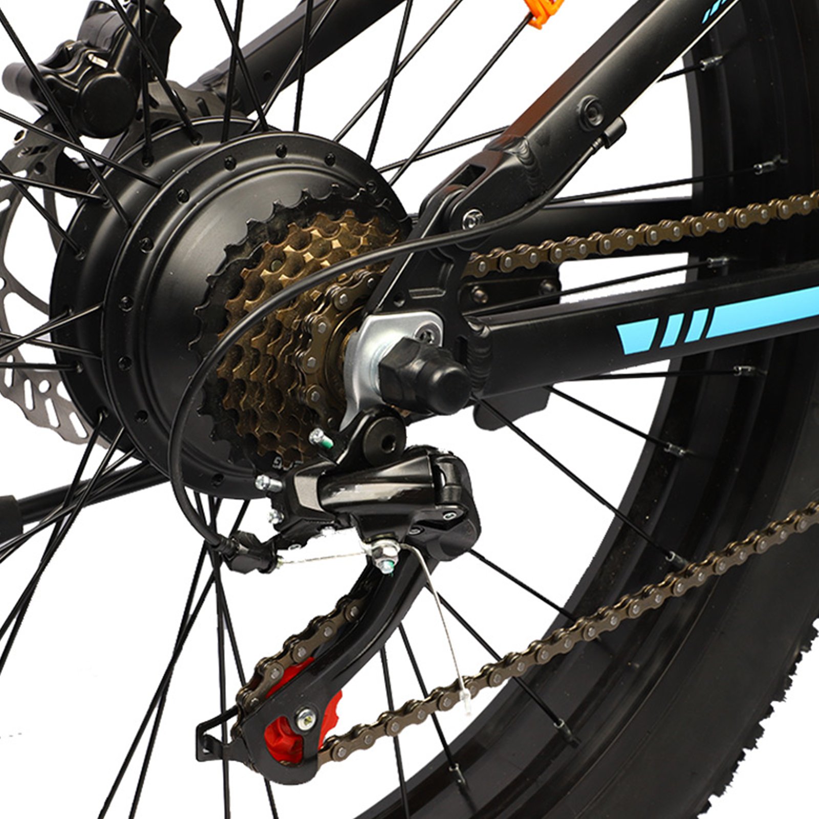 Built with a 6061 aluminum alloy frame and 26×4.0 inch tires, the FB08 offers excellent stability, smooth rolling, and confident control on paved roads, gravel paths, and light trails. The larger wheel size improves efficiency and comfort, making it ideal for longer rides and everyday commuting.